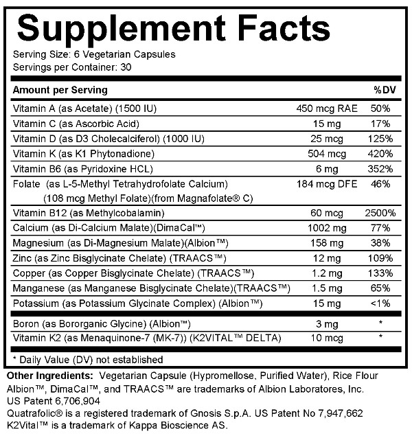 A comprehensive full-spectrum, high-absorption, fully-chelated calcium along with many other nutrients (including vitamin A, vitamin C, vitamin D3, vitamin K1, vitamin K2, vitamin B6, methyl folate, vitamin B12, magnesium, zinc, copper, manganese, potassium, and boron) that may be helpful in supporting healthy bones. This formula is exceptional for those who want optimal nutrition, especially those who have bowel sensitivity to magnesium. ‡